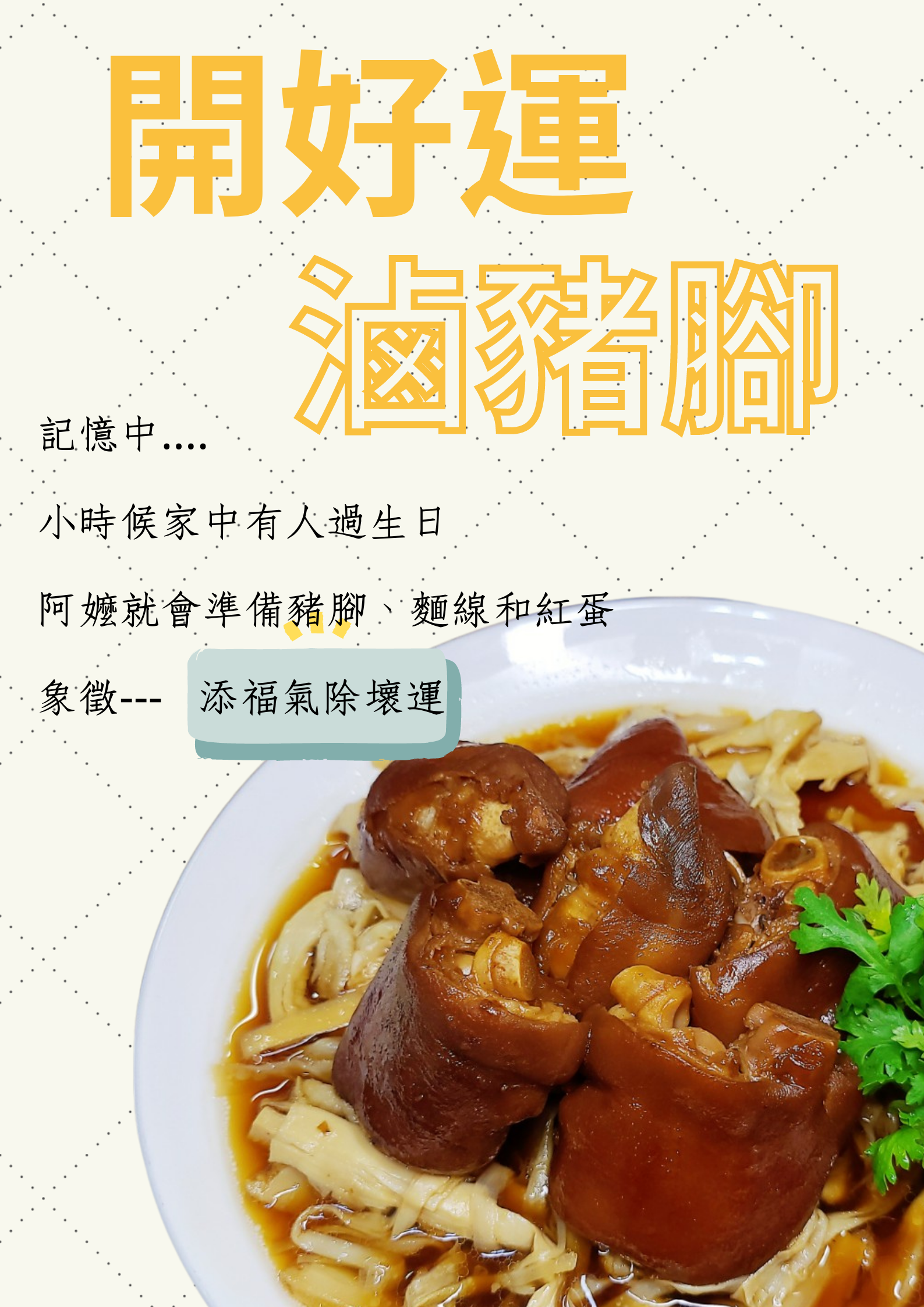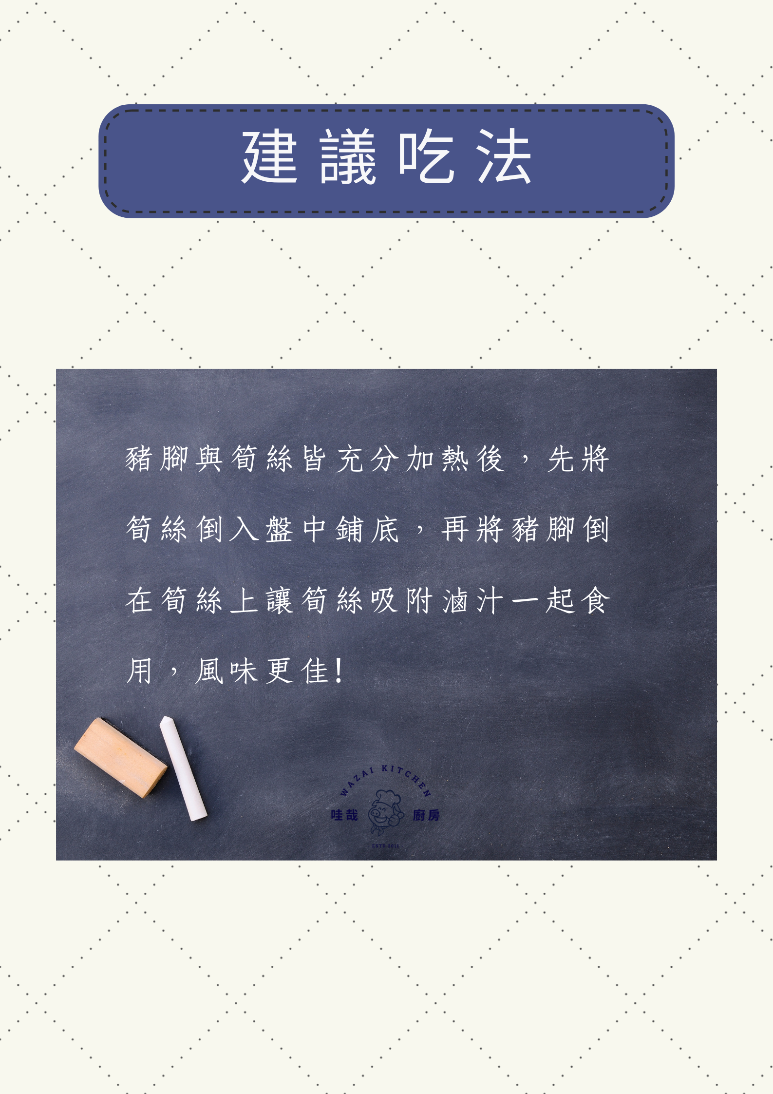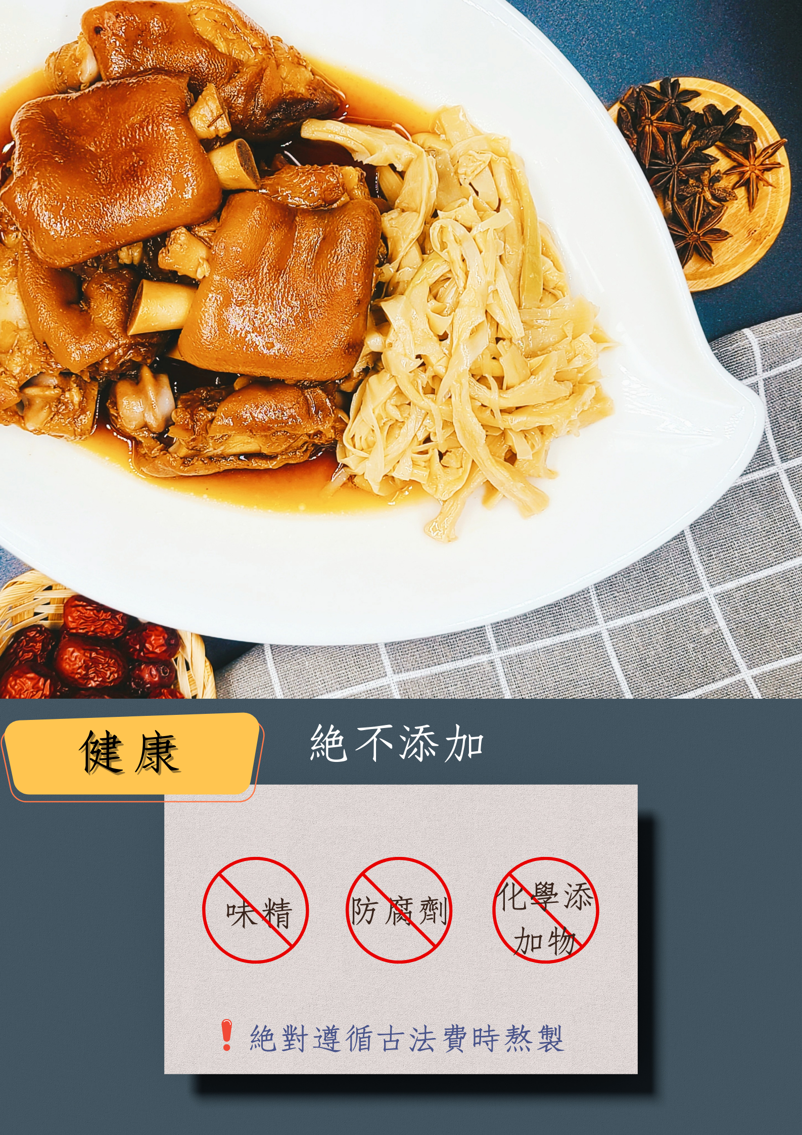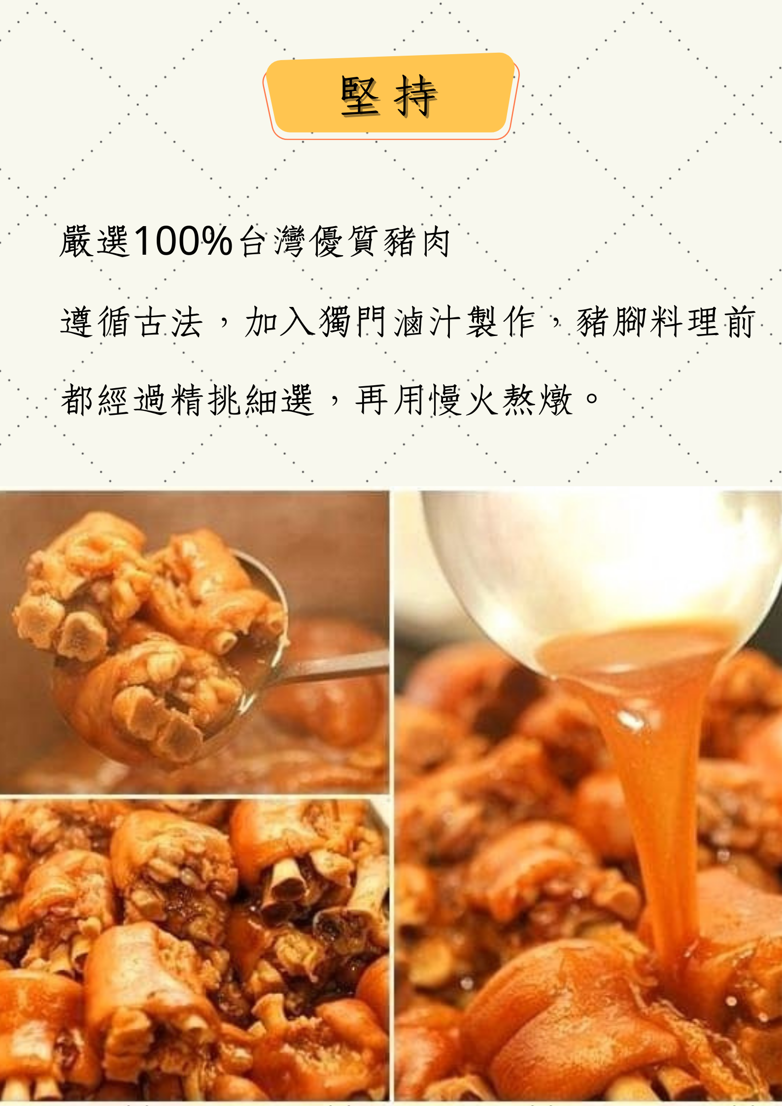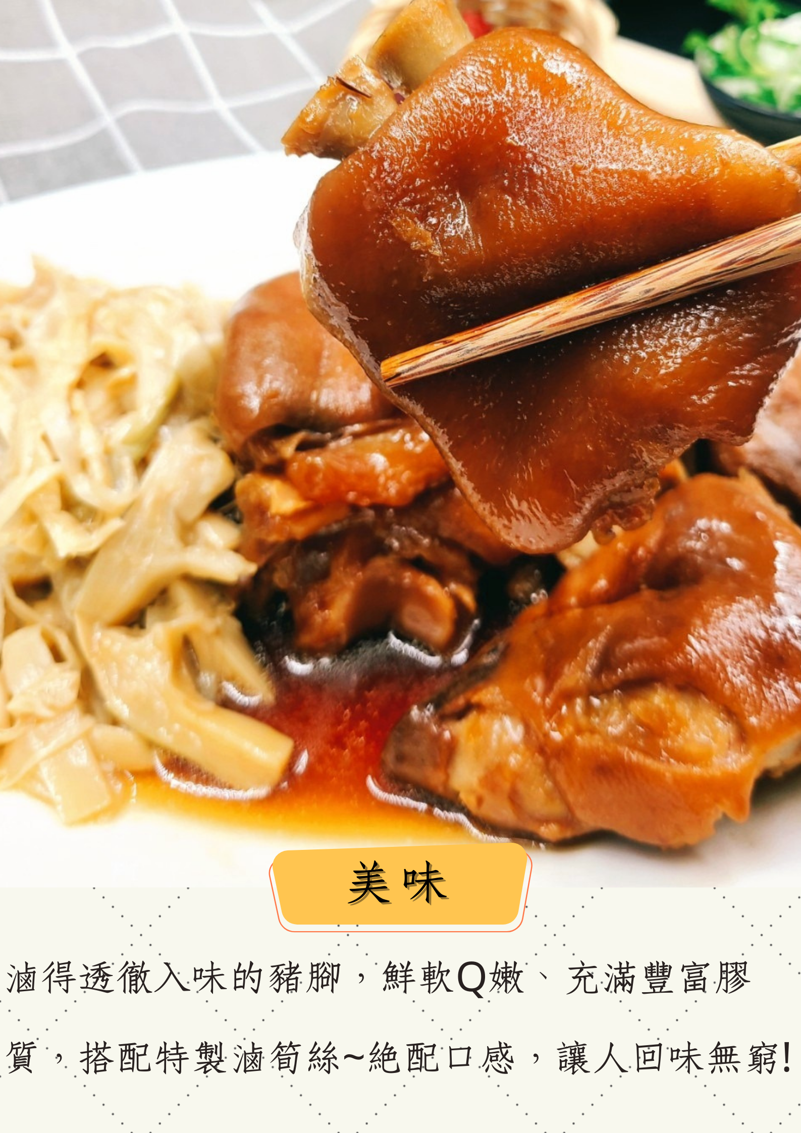 遵循古法,加入獨門滷汁製作,豬腳料理前都經過精挑細選,再用慢火熬燉, 滷得透徹入味的豬腳,鮮軟Q嫩、充滿豐富膠質,搭配特製滷筍絲~絕配口感
