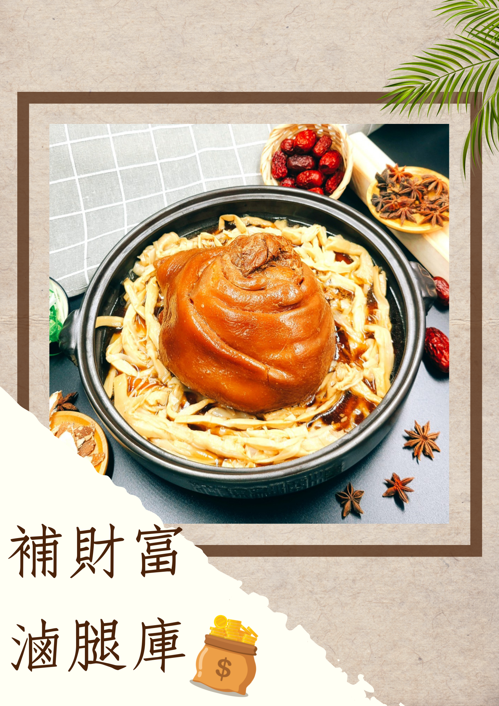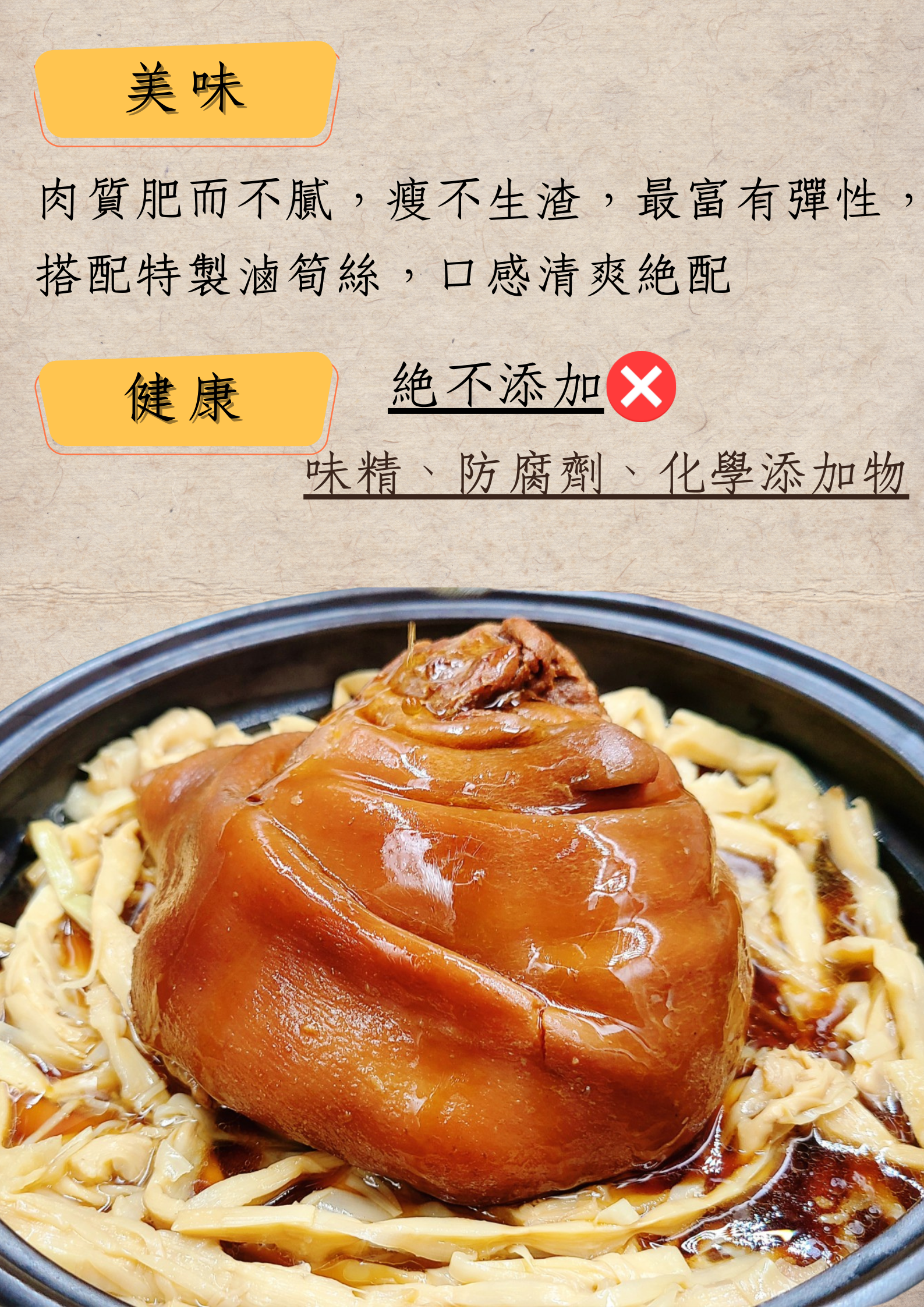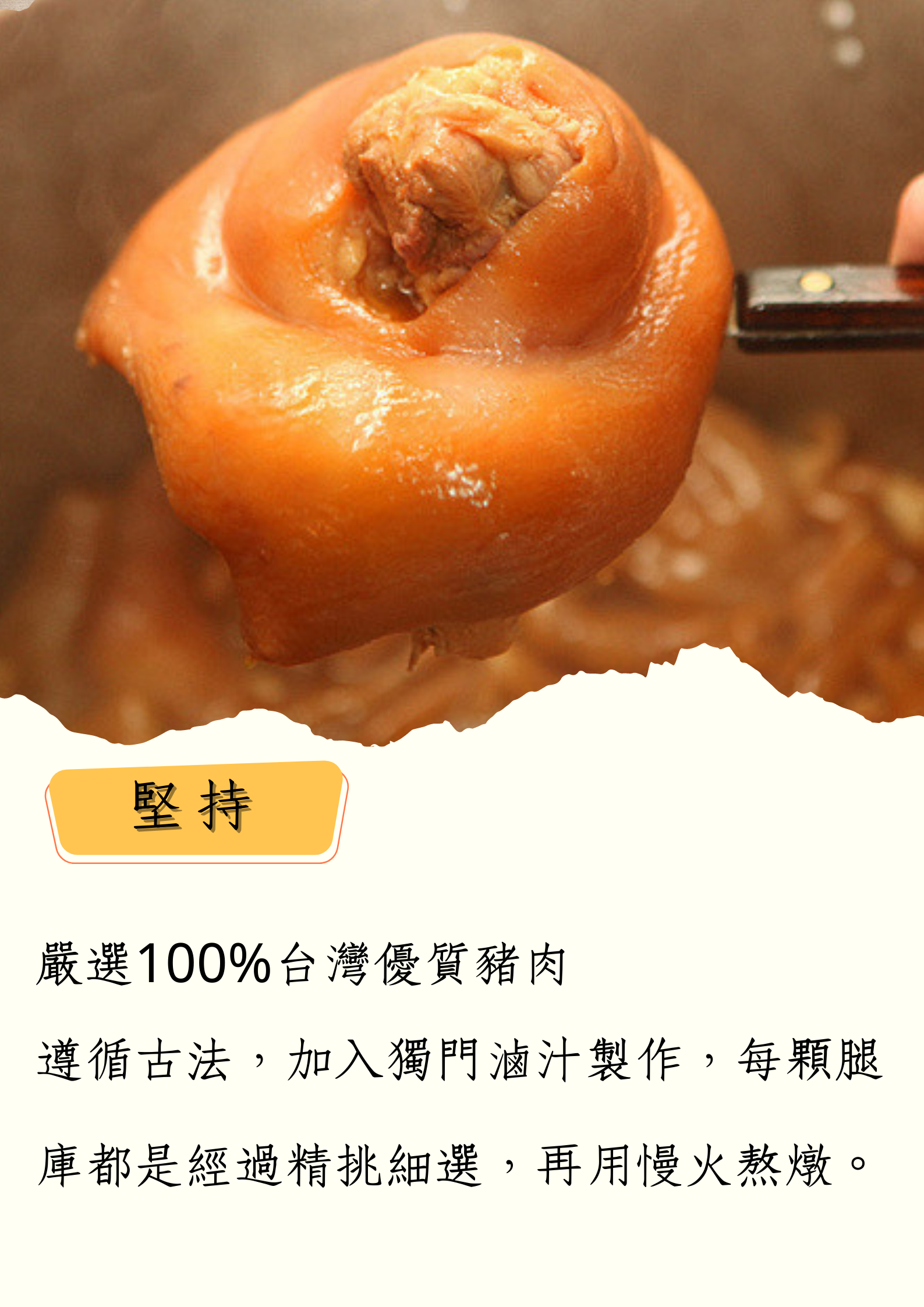 遵循古法,加入獨門滷汁製作,料理前都經過精挑細選,再用慢火熬燉, 滷得透徹入味的腿庫,鮮軟Q嫩、充滿豐富膠質